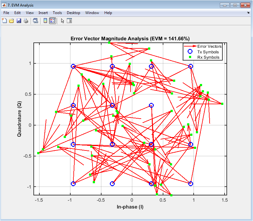 The error vector magnitude (EVM) analysis plot shows the error vectors between the transmitted and received symbols, with the in-phase (I) component on the x-axis and the quadrature (Q) component on the y-axis. The plot displays the transmitted symbols in blue, the received symbols in green, and the error vectors in red. The EVM plot provides insight into the signal quality, including the effects of noise, distortion, and fading. In this case, the EVM plot shows a moderate level of noise and distortion in the received signal. The plot helps to evaluate the performance of the digital communication system and diagnose issues with the signal quality. The EVM analysis plot is particularly useful for evaluating the effects of modulation schemes and equalization techniques on the signal quality. The diagram can be used to optimize the system parameters, such as the equalizer coefficients, to improve the performance.