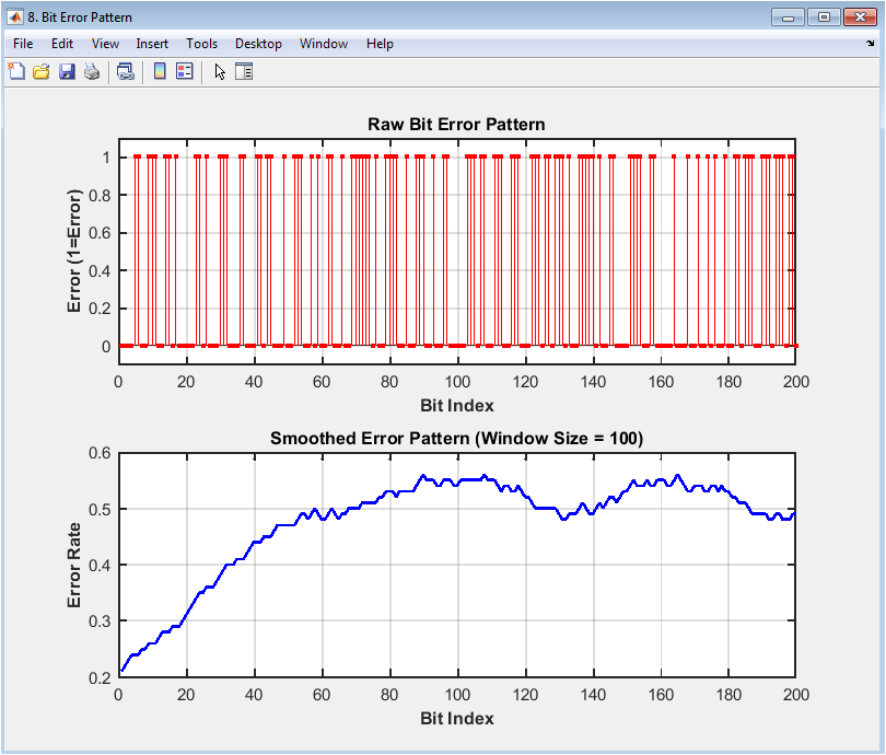 The bit error pattern plot shows the bit errors in the received signal, with the bit index on the x-axis and the error on the y-axis. The plot displays the bit errors as red dots. The plot provides insight into the error pattern, including the effects of noise, distortion, and fading. In this case, the plot shows a random error pattern, indicating a moderate level of noise and distortion in the received signal. The plot helps to evaluate the performance of the digital communication system and diagnose issues with the signal quality. The bit error pattern plot is particularly useful for evaluating the effects of channel impairments and equalization techniques on the received signal. The diagram can be used to optimize the system parameters, such as the equalizer coefficients, to improve the performance.