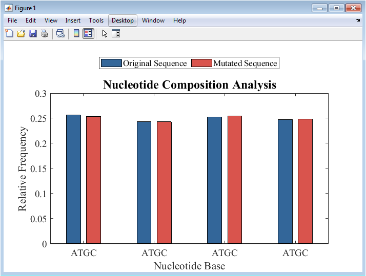 In conclusion, the proposed MATLAB-based DNA sequencing analysis system provides a comprehensive and integrated framework for examining genomic sequences. By combining nucleotide frequency analysis, sliding-window GC content, global alignment, mutation detection, k-mer frequency, and Shannon entropy profiling, the system captures both global and local sequence characteristics [28]. The introduction of synthetic mutations allows controlled evaluation of algorithmic performance and sequence variability. High-quality visualizations enhance interpretability and facilitate comparative analysis between original and mutated sequences. Results demonstrate the effectiveness of combining statistical, alignment-based, and information-theoretic approaches for robust genomic characterization [29]. The modular and extensible design supports parameter adjustments for diverse research and educational applications. The framework enables reproducible and systematic exploration of sequence complexity and mutation impact. It serves as a valuable tool for bioinformatics, computational genomics, and methodological development [30]. Overall, this study highlights the power of integrating multiple computational techniques for comprehensive DNA sequence analysis. The system lays a foundation for future enhancements, including advanced mutation modeling and machine learning integration.