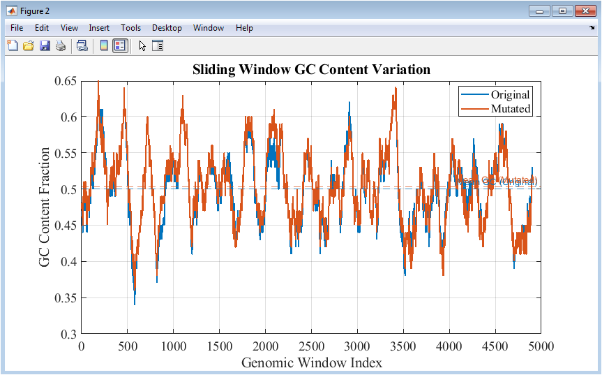 Figure 3 presents the GC content calculated over a sliding window along the DNA sequence. Line plots compare the original and mutated sequences, showing how guanine and cytosine proportions vary across different genomic regions. Mean GC content for each sequence is indicated with dashed horizontal lines, providing a reference for average composition. Regions with consistently high or low GC content can indicate functional elements, structural motifs, or evolutionary constraints. Mutations introduce small fluctuations in local GC fractions, which are visually captured in the plot. The sliding-window approach allows detection of heterogeneity that global averages cannot reveal. Color differentiation ensures clear distinction between the sequences. Grid lines and axis labels facilitate accurate interpretation of trends. This figure provides insights into genomic organization and highlights the impact of mutations on regional nucleotide composition.