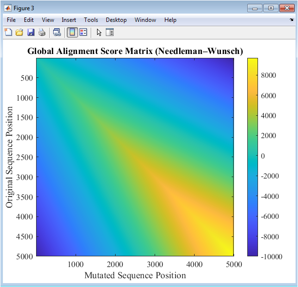 Figure 4 visualizes the scoring matrix obtained from global sequence alignment using the Needleman–Wunsch algorithm. Each cell in the heatmap represents the alignment score between subsequences of the original and mutated DNA. High scores indicate matches, while lower or negative values reflect mismatches or gaps. The diagonal of the matrix corresponds to perfectly aligned sequences, with deviations caused by mutations or insertions. The colormap emphasizes score variations, making regions of similarity and divergence immediately apparent. This figure enables quantitative and visual assessment of sequence similarity. Mutations result in localized dips in the alignment scores along the diagonal. Understanding these patterns is critical for mutation impact analysis and evolutionary studies. The matrix also serves as a reference for validating scoring parameters like match, mismatch, and gap penalties. Figure 4 provides a comprehensive view of sequence-level alignment.