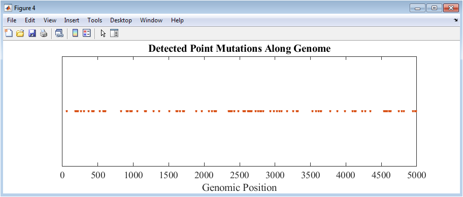 Figure 5 shows a scatter plot of all detected mutations along the genome. Each point represents the position of a base change introduced during the mutation simulation. The y-axis is uniform, emphasizing the distribution along the genomic positions rather than quantitative magnitude. Clustering or gaps in mutation locations can indicate hotspots or regions of conservation. Color and marker styling make the points easily distinguishable. This visualization allows immediate identification of the frequency and density of mutations across the sequence. It is particularly useful for comparing the effect of different mutation rates or models. The mutation map directly connects sequence alterations to their genomic positions, aiding downstream analyses. By comparing this map with GC content or entropy profiles, correlations between mutation density and sequence features can be observed. Figure 5 provides an intuitive overview of mutation impact.