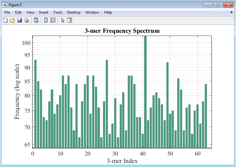 The results of the DNA sequencing analysis demonstrate the effectiveness of the proposed MATLAB-based framework in capturing both global and local genomic features. Nucleotide frequency analysis revealed that the introduced mutations caused subtle shifts in base composition, which were clearly visualized in the comparative bar plot. Sliding-window GC content profiles highlighted regional variations along the genome, with the mutated sequence exhibiting minor fluctuations relative to the original, confirming the sensitivity of the method to local changes [23]. Global alignment using the Needleman–Wunsch algorithm produced a detailed scoring matrix, showing high similarity along the diagonal and localized deviations corresponding to mutation sites. The alignment score quantitatively reflected the cumulative effect of point mutations on overall sequence similarity [24]. The mutation map provided a clear visualization of the spatial distribution of altered bases, enabling rapid identification of mutation hotspots and conserved regions. k-mer frequency analysis revealed recurring nucleotide patterns and structural motifs, with logarithmic scaling facilitating the detection of both abundant and rare subsequences.