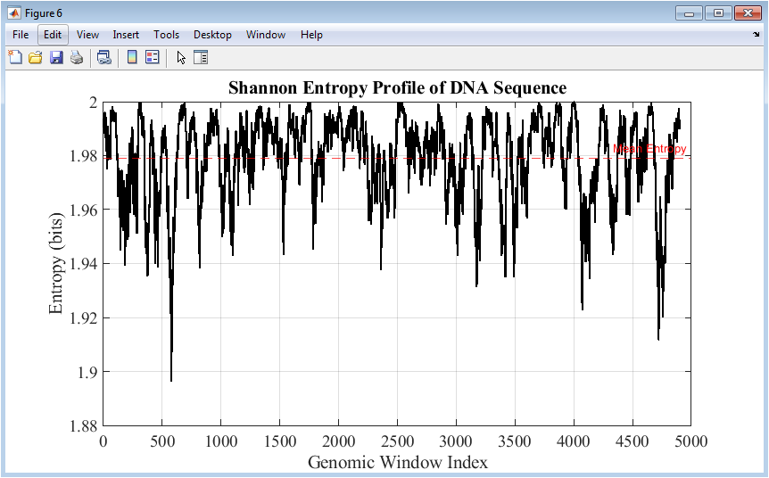 Figure 7 shows the Shannon entropy profile computed over sliding windows along the DNA sequence. Higher entropy values indicate regions of greater nucleotide randomness, while lower values suggest structured or conserved areas. The mean entropy is highlighted with a dashed line for reference. Entropy profiles are sensitive to both sequence composition and mutations, revealing how changes affect local complexity. This figure complements GC content and k-mer analyses by quantifying information-theoretic properties. Peaks and valleys correspond to regions with variable sequence patterns or repeated elements. The analysis helps in identifying functional genomic regions and understanding mutation effects on sequence structure. The continuous line plot ensures smooth visualization of local variations. Figure 7 integrates statistical and informational perspectives for a holistic understanding of genome architecture.