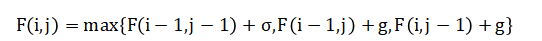 Global sequence alignment is formulated using dynamic programming, with the scoring matrix defined as: