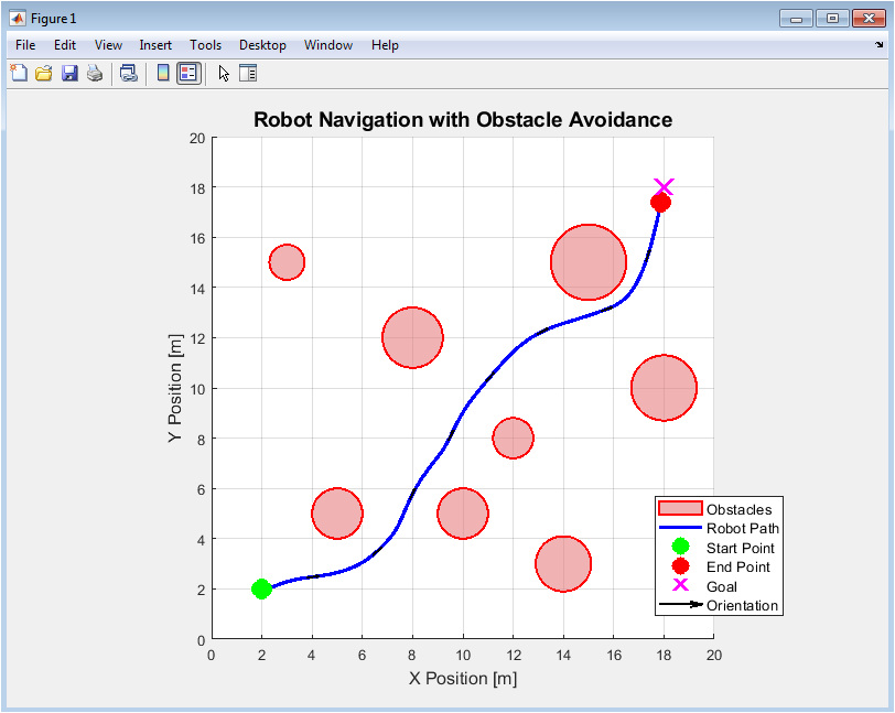 Figure 2 illustrates the complete navigation path of the robot. It shows the robot’s start and end positions, the goal location, and the circular static obstacles in the environment. The blue trajectory line demonstrates how the algorithm successfully guided the robot around obstacles, with orientation arrows indicating its heading at key points. The plot visually validates the obstacle avoidance capability as the path deviates from a straight line to maintain safe distances. Green and red markers clearly distinguish the start and end points, while the magenta ‘X’ marks the final target. This holistic view is essential for assessing overall path planning success and spatial awareness.