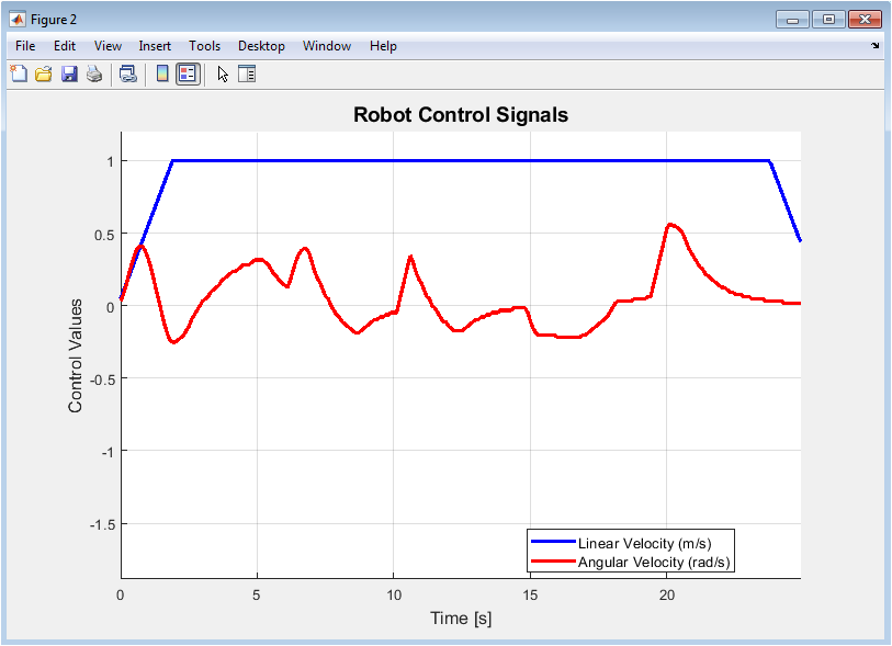 Figure 3 displays the time-history of the robot’s commanded control signals. The blue line shows the linear velocity (v), varying between zero and the maximum limit as the robot accelerates, decelerates, or stops to navigate turns. The red line represents the angular velocity (omega), showing both positive (counter-clockwise) and negative (clockwise) rotations required for steering. Sharp changes in these signals correspond to reactive maneuvers near obstacles. This plot is critical for analyzing control effort, actuator demands, and the smoothness of commanded motions over the entire mission duration.
