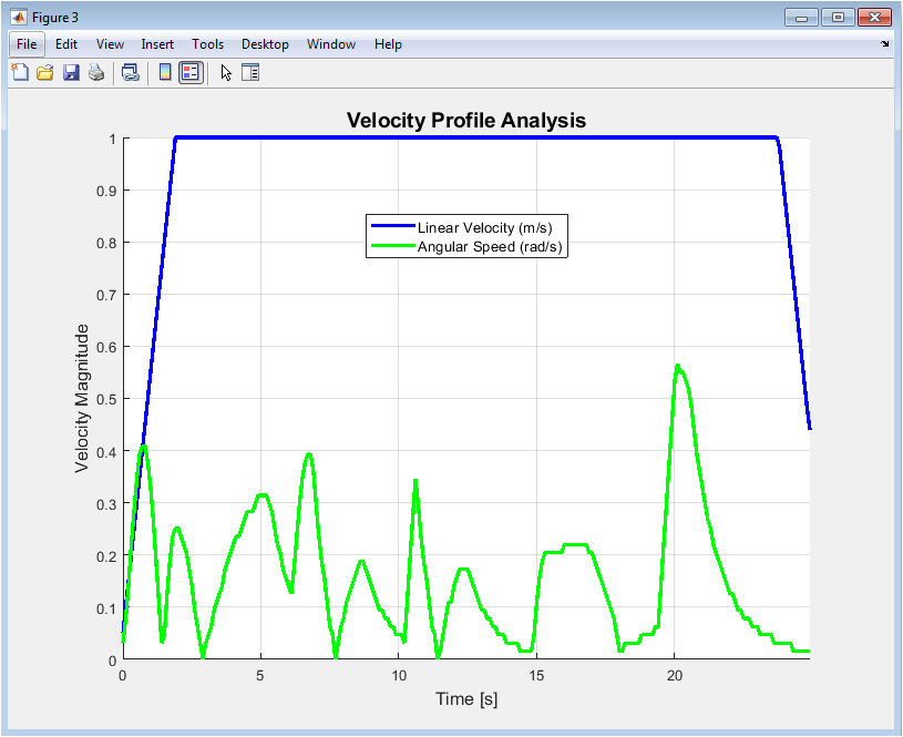 Figure 4 presents an analysis of the robot’s velocity profile, focusing on magnitude. It plots the linear velocity alongside the absolute value of the angular velocity, termed angular speed. This allows for a direct comparison of translational and rotational motion intensities. Periods of high angular speed often coincide with reduced linear speed, illustrating the trade-off between turning and forward progress. The chart helps identify phases of aggressive maneuvering versus straight-line cruising, providing insight into the algorithm’s velocity modulation in response to environmental complexity.