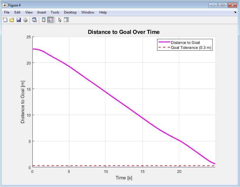 Figure 5 tracks the robot’s progress by plotting its Euclidean distance to the goal over time. The magenta line shows this distance generally decreasing as the robot advances, with occasional plateaus or slight increases during detours. A dashed red horizontal line marks the goal tolerance threshold; success is achieved when the trajectory crosses below this line. This plot is a direct performance metric, showing convergence and mission completion time. It clearly visualizes the effectiveness of the path in minimizing the distance to the target despite necessary deviations.