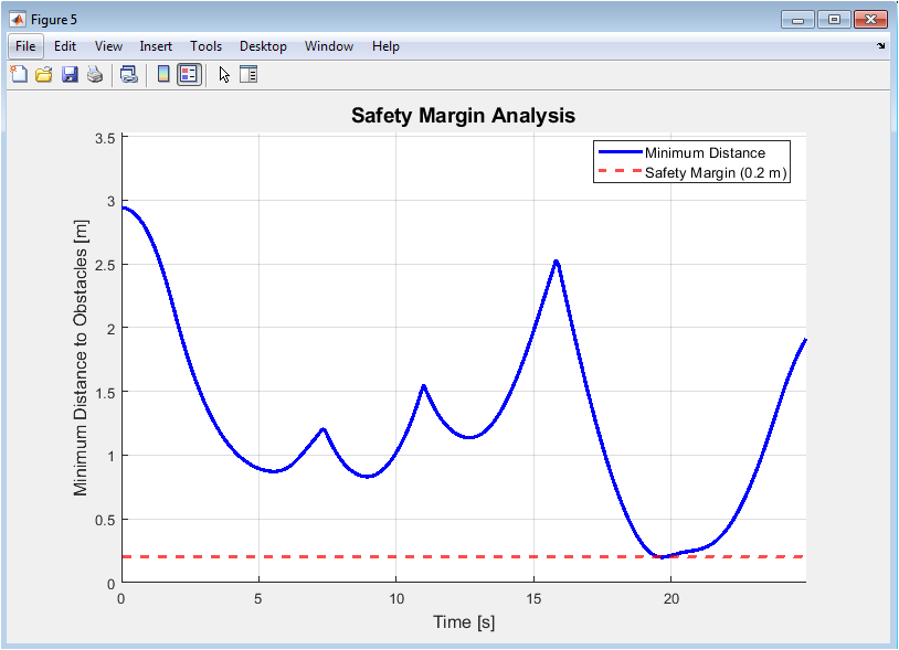 Figure 6 provides a safety analysis by plotting the minimum distance between the robot and any obstacle at each time step. The blue line shows this clearance, while the dashed red line indicates the required safety margin. Values dipping below the safety line represent potential safety violations, marked with red ‘X’s. This figure is paramount for validating the robot’s operational safety, ensuring it maintains a buffer zone. It quantitatively demonstrates the algorithm’s ability to prioritize collision avoidance, a fundamental requirement for robust autonomous navigation.