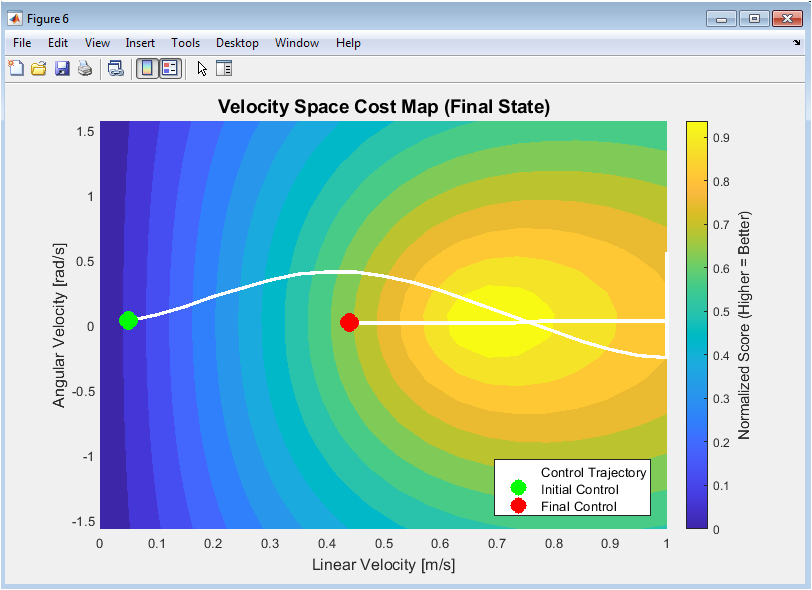 Figure 7 visualizes the algorithm’s decision-making process in velocity space for a final simulation state. The contour map color-codes the normalized score (cost) for different linear and angular velocity pairs, with warmer colors typically indicating better, more optimal choices. The white line traces the historical sequence of selected controls throughout the mission. This plot reveals the structure of the optimization problem, showing feasible regions and how the chosen controls navigate this landscape to balance competing objectives like speed and safety.