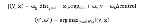 The mathematical approach is centered on constrained optimization in velocity space. At each time step, the robot’s admissible velocities are constrained by a dynamic window derived from its current state and acceleration limits: