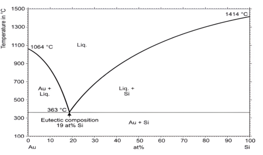 Eutectic bonding relies on creating a eutectic system, where a specific composition of metals can melt at a singular eutectic temperature. In the case of EELs, the Au-Sn (gold-tin) system is prevalently used due to its favorable eutectic temperature of around 280 degrees Celsius, which is suitable for many 3D wafer bonding applications. This system facilitates a clean transition from solid to liquid phase without the coexistence of the two, which is crucial for creating a reliable bond without the need for high temperatures that could damage sensitive semiconductor devices. As depicted in Figure 1, the eutectic composition at 19 at% Si demonstrates the precise melting point required for such bonding [9].