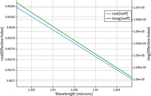 - Fig. 10. Effective Index plot indicating stable mode confinement over the central 1550 nm wavelength range