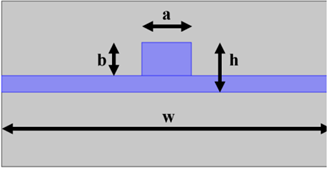 - Fig. 11. Transverse cross-section of rib waveguide with parameters (Core Width – a, Core Trench Height (or etch depth) – b, Core Maximum Height – h, Waveguide Width – w)