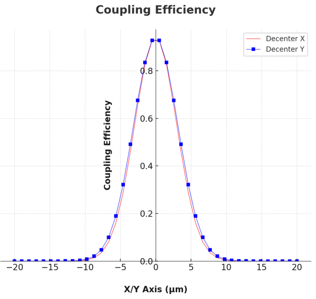 The simulation data depicted in Figure 13 presents the calculated coupling efficiencies as a function of lateral misalignment in both the X and Y axes. The peak coupling efficiency is observed at the center of the optical axis, sharply decreasing as the lateral misalignment increases. The maximum coupling efficiency, 94%, signifies an excellent concentration of optical power in the waveguide. The Decenter X and Decenter Y lines follow a similar trend, suggesting a symmetric response to