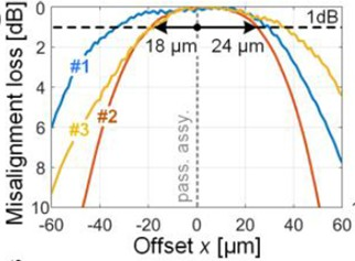 waveguide. This method is characterized by low insertion loss, rendering it highly efficient and wavelength-independent. Such attributes are crucial for applications demanding high throughput and reliability. The spatial alignment and chip geometry, albeit demanding in precision, contribute to the effective coupling of the EELs to the waveguides, as evidenced by the direct correlation between misalignment loss and offset depicted in the associated figures.