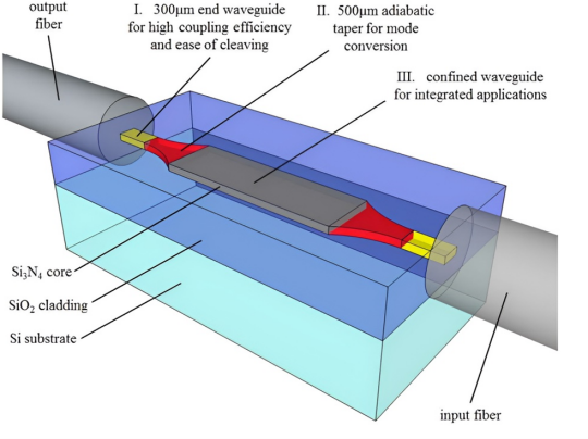 1) Waveguide Coupler Design: The Si3N4/SiO2 waveguide coupler design, as depicted in Figure 7, employs a three-part structure to optimize fiber-to-waveguide coupling on a silicon substrate. The primary borrowed concept is the use of a Si3N4 core and SiO2 cladding, which, compared to SOI platforms, provides transparency across a broader spectrum – from the visible to the near-infrared – offering particular advantages for sensor and astronomy applications due to this extended operation range [35], [36].