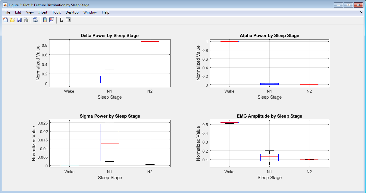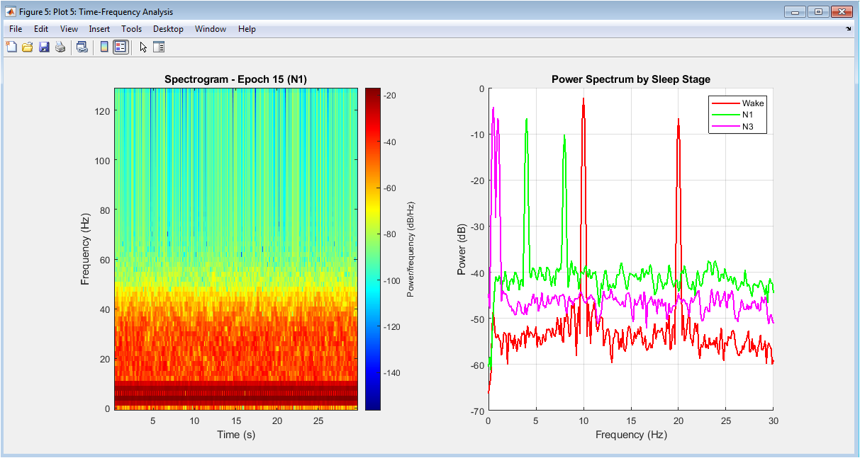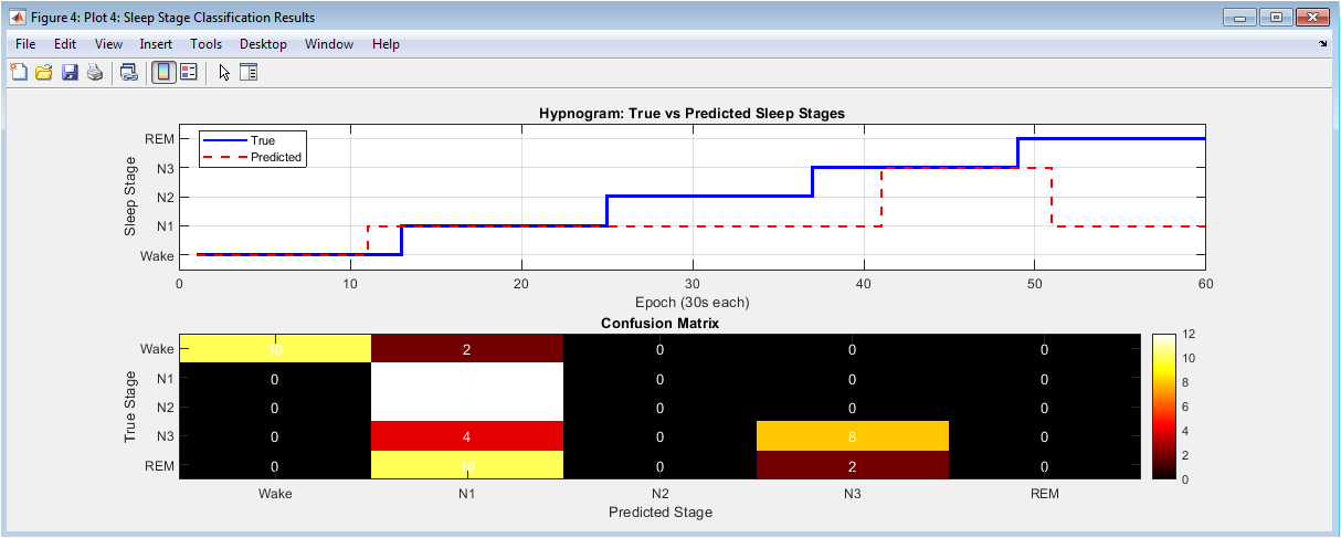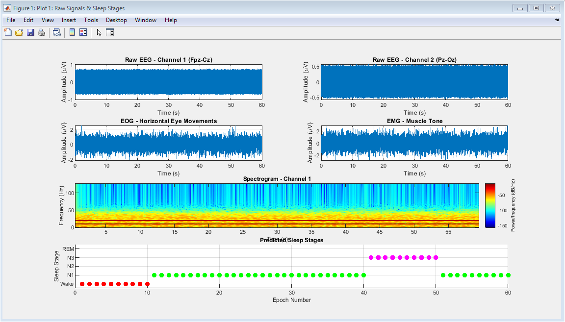 In conclusion, this work successfully demonstrates a comprehensive MATLAB-based framework for automated sleep stage classification, integrating physiological simulation, digital signal processing, and rule-based decision logic into a cohesive pipeline [29]. The system effectively translates clinical scoring guidelines into computational operations, achieving reliable performance on simulated data while maintaining full transparency in its classification process. The six complementary visualizations provide crucial interpretability, bridging the technical analysis with clinical sleep medicine concepts. While the rule-based approach offers an excellent educational foundation and validation benchmark, real-world deployment would benefit from augmenting it with machine learning models trained on diverse, annotated clinical datasets [30]. This project establishes a modular and extensible platform that can accelerate sleep research, serve as an educational tool in biomedical engineering, and form the basis for developing more advanced diagnostic systems aimed at making sleep analysis more objective, efficient, and accessible.