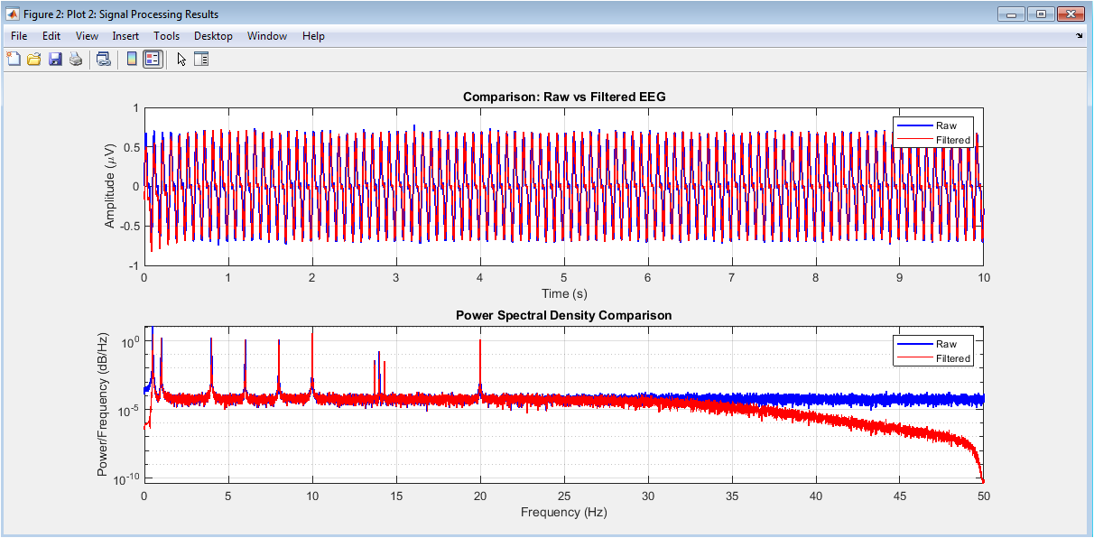 Comparison of raw versus processed EEG signals and their corresponding power spectral densities. The top panel juxtaposes 10 seconds of unfiltered EEG data (blue) with the cleaned, filtered output (red), demonstrating the effective removal of high-frequency noise and baseline wander while preserving physiological waveforms. The bottom panel displays logarithmic power spectral density plots for both signal conditions, highlighting how preprocessing eliminates broadband noise and attenuates the 50 Hz power line interference while maintaining the integrity of clinically relevant frequency bands. This figure validates the preprocessing pipeline’s efficacy in enhancing signal-to-noise ratio and preparing the data for subsequent feature extraction, crucial for accurate sleep stage classification.