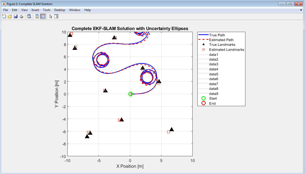 This figure presents the comprehensive output of the EKF-SLAM algorithm, visualizing the spatial relationship between the robot’s path and the environment map. The blue solid line represents the true trajectory that the robot actually followed, while the red dashed line shows the estimated path calculated by the filter. Black triangles indicate the actual positions of landmarks in the environment, and red squares show where the algorithm believes those landmarks are located. Green dotted ellipses surrounding the estimated landmarks represent 2σ uncertainty regions derived from the covariance matrix, showing areas where each landmark is likely to exist with 95% confidence. Start and end points are marked with green and red circles respectively. The plot demonstrates how well the algorithm performs in both localizing the robot and mapping its surroundings, with tight uncertainty ellipses indicating high confidence estimates. Visual inspection reveals how the estimated trajectory closely follows the true path and how landmark estimates cluster around their true positions, providing immediate qualitative assessment of SLAM performance.