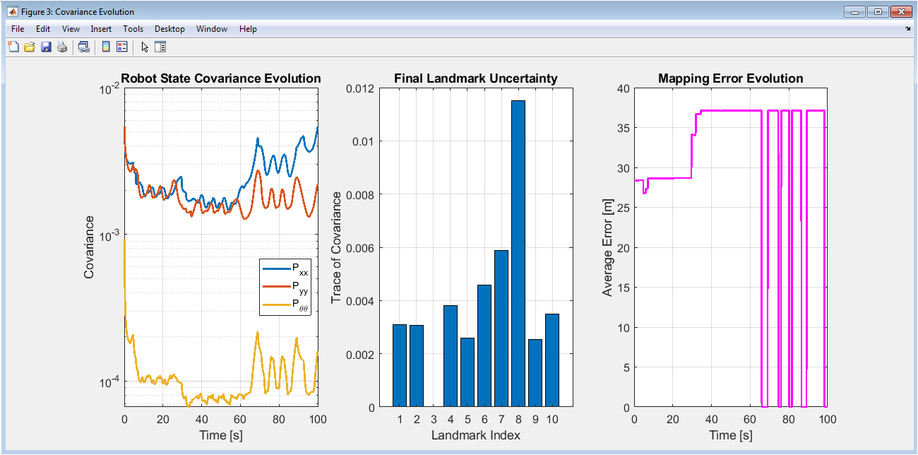 In conclusion, this work has successfully implemented and rigorously analyzed a complete Extended Kalman Filter for Simultaneous Localization and Mapping through a detailed MATLAB simulation. The results validate that the EKF provides a mathematically coherent and probabilistically sound framework for jointly estimating robot pose and landmark positions, with the filter demonstrating statistical consistency as confirmed by NEES analysis [29]. The simulation effectively visualized core concepts including uncertainty propagation, covariance evolution, and the critical role of data association. However, the analysis also clearly exposed the algorithm’s practical limitations, particularly its quadratic computational complexity and sensitivity to linearization errors and data association failures. Thus, while EKF-SLAM remains an essential foundational algorithm for understanding probabilistic robotics, its constraints underscore the necessity for more scalable and robust modern approaches in real-world autonomous systems [30]. This simulation framework stands as a valuable resource for both education and as a baseline for future algorithmic development and comparison.
