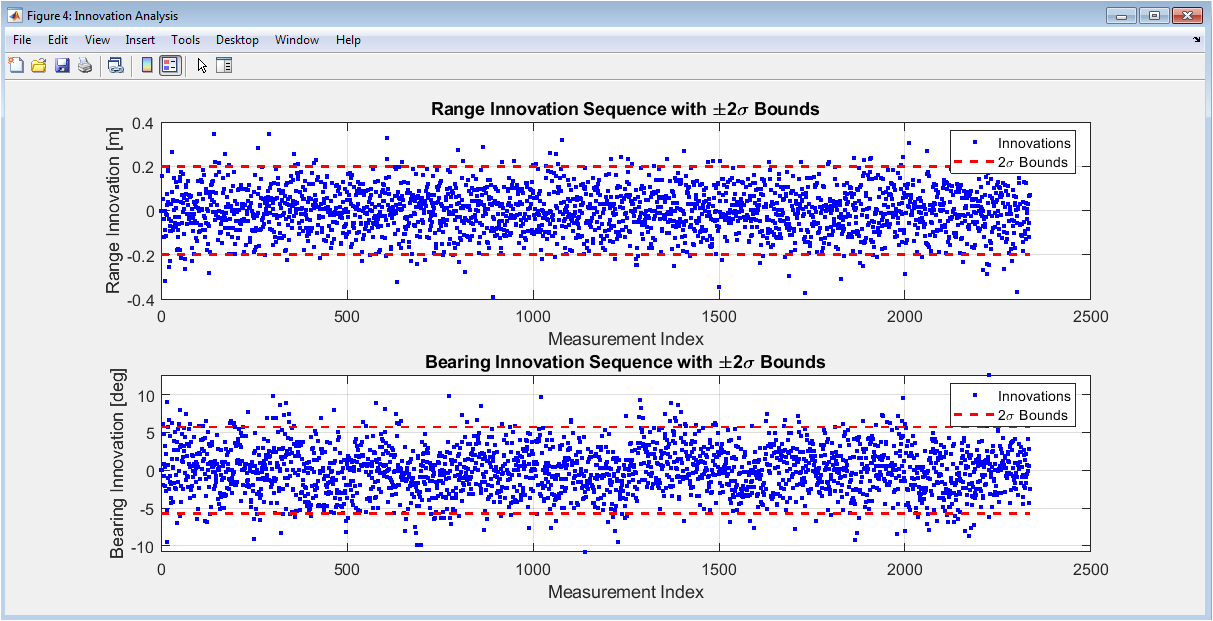 This figure analyzes the innovation sequence the difference between actual sensor measurements and predicted measurements which provides critical information about filter tuning and performance. The upper subplot shows range innovations (distance measurements), while the lower subplot shows bearing innovations (angle measurements), both with ±2σ bounds. Ideally, innovations should be zero-mean, white (uncorrelated), and approximately 95% should fall within the 2σ bounds. Systematic patterns or biases in the innovation sequence indicate model mismatch or incorrect noise assumptions. For example, if innovations consistently trend in one direction, it suggests the motion model or sensor calibration may be incorrect. The whiteness property indicates whether all available information has been properly extracted from measurements. This analysis is essential for tuning process and measurement noise parameters (Q and R matrices) and for detecting potential issues in the system models before they cause filter divergence.