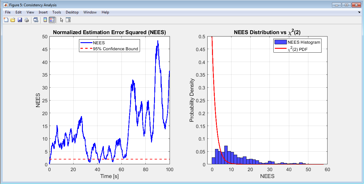 This figure performs formal statistical consistency testing using the Normalized Estimation Error Squared (NEES) metric, which is crucial for validating whether the filter’s uncertainty estimates are statistically accurate. The left panel shows NEES values over time compared to the 95% confidence bound for a χ² distribution with 2 degrees of freedom (appropriate for position errors). Ideally, NEES should fluctuate around this bound. The right panel compares the histogram of NEES values against the theoretical χ²(2) probability density function. Good agreement indicates the filter is consistent its covariance matrix accurately represents actual estimation uncertainty. Significant deviation above the bound suggests the filter is overconfident (underestimating uncertainty), while values consistently below indicate overconservatism. This analysis is particularly important for SLAM applications where safety-critical decisions depend on accurate uncertainty quantification, and it provides statistical evidence beyond visual inspection of error plots.