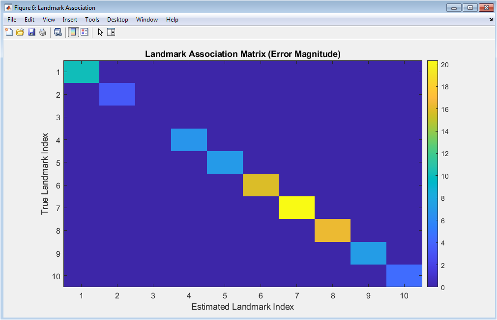 This figure visualizes the data association performance through an association matrix that maps true landmarks to their estimated counterparts. The color intensity at position (i,j) represents the Euclidean distance error when true landmark i is associated with estimated landmark j. A perfect diagonal pattern with low error values indicates correct associations throughout the simulation. Off-diagonal entries represent association errors, where the algorithm incorrectly matched measurements to wrong landmarks. Blank rows indicate true landmarks that were never observed, while blank columns show estimated landmarks that don’t correspond to any real feature (possibly due to spurious measurements). This visualization is crucial for understanding one of the most challenging aspects of SLAM maintaining correct correspondences between measurements and map features and helps identify specific landmarks where association problems occur, which is essential for improving data association algorithms.