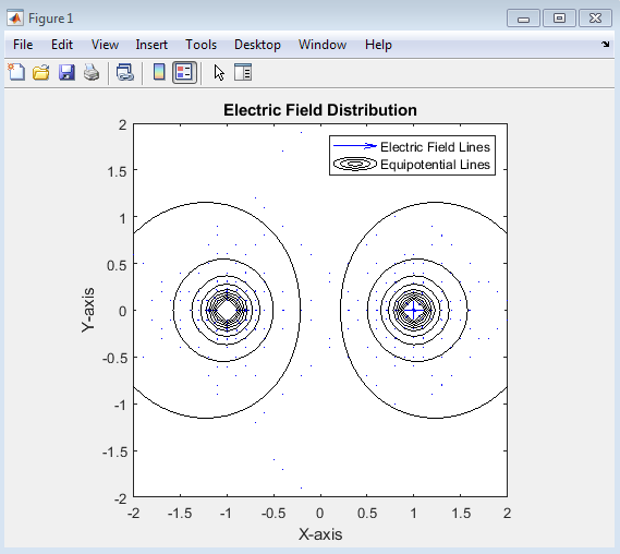 The MATLAB-generated Electric Field Distribution graph provides a complete visual representation of how electric field vectors and equipotential lines are distributed in space due to one or more point charges. It demonstrates the direction, strength, and spatial variation of the electric field according to Coulomb’s law and the superposition principle.The quiver plot displays electric field vectors (arrows) that indicate both the direction and relative magnitude of the electric field at different points in space. The contour plot overlays equipotential lines, which are curves connecting points of equal electric potential. Together, these two plots provide a two-dimensional visualization of the electrostatic field and potential distribution in the region of interest [8].