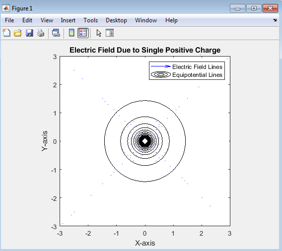 The MATLAB-generated graph for the single positive charge configuration illustrates the fundamental pattern of an electrostatic field produced by a solitary point charge in a uniform medium. This graph serves as the most basic and essential case in understanding electric field behavior.