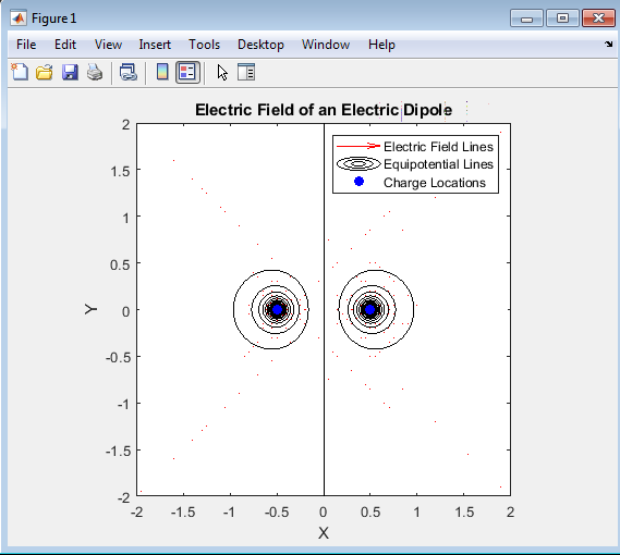 The quiver plot displays electric field vectors as arrows showing the direction and relative strength of the field. The contour lines indicate equipotential surfaces—regions of constant electric potential. The blue circles mark the positions of the positive and negative charges. The overall graph combines both field and potential visualization, giving a comprehensive understanding of the dipole’s behavior. Field lines originate from the positive charge (+q) and terminate on the negative charge (−q). Near each charge, the field lines are dense, representing strong electric field regions. In the mid-region between charges, field lines curve sharply, illustrating how the fields from each charge interact. At points far away from the dipole, the field pattern resembles that of a single charge with decreasing intensity (∝ 1/r³). The symmetry of the field about the central (x) axis is clearly visible. Equipotential lines are shown as contour curves perpendicular to the field lines. Lines of positive potential surround the positive charge, while negative potential contours encircle the negative charge.[9]