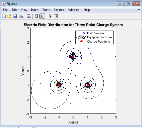 The MATLAB-generated graph for the three-point charge system illustrates the combined electric field distribution resulting from the superposition of fields produced by three point charges arranged in a triangular configuration. The quiver plot shows electric field vectors (arrows) indicating the direction and relative strength of the electric field at each point in space. The contour lines represent equipotential surfaces — regions of equal electric potential. The red circles denote the positions of the charges in the system. Around positive charges: Field lines radiate outward, indicating repulsion. Around negative charges: Field lines converge inward, indicating attraction. Between opposite charges: The field lines curve and connect, representing the interaction region where forces balance partially. The density of field lines indicates field strength — denser regions correspond to higher electric field intensity. The spatial variation of electric field strength. The relationship between field lines and equipotential surfaces. The effectiveness of MATLAB visualization in studying complex electrostatic systems[10].