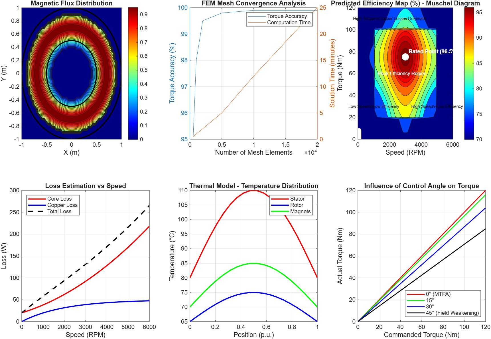 This figure 4 demonstrates the simulation techniques used to predict motor behavior before prototyping. The first subplot shows magnetic flux distribution in the motor cross-section, with flux concentrated in the stator teeth and air gap, using color mapping to indicate flux density magnitude. The stator and rotor boundaries are outlined in black, showing the flux paths across the air gap. The second subplot presents FEM mesh convergence analysis, with torque accuracy improving from 95% to 99.9% as mesh elements increase from 500 to 20,000, while computation time increases from 0.5 to 25 minutes, indicating that 10,000 elements provide optimal balance (99.8% accuracy, 12 minutes). The third subplot displays the predicted efficiency map across torque-speed operating range, with peak efficiency of 96.5% occurring at 3000 RPM and 75 Nm (rated point marked in white), and efficiency contours showing degradation at very low speeds (core losses) and very high speeds (friction and windage). The fourth subplot shows loss estimation versus speed, with core losses increasing from 20 W to approximately 120 W at 6000 RPM due to eddy current and hysteresis effects, while copper losses decrease from 50 W to near zero as current reduces at high speeds, and total loss showing a minimum around 3000 RPM. The fifth subplot presents thermal model temperature distribution, showing stator temperature reaching 110°C at hotspots, rotor temperature at 75°C, and magnets at 85°C, with sinusoidal variation around the circumference due to non-uniform loss distribution and cooling effects. The sixth subplot illustrates control angle influence on torque output, showing that at 0° (MTPA), torque follows the commanded value linearly, while at 45° (field weakening), torque output is reduced to approximately 70% of commanded value, demonstrating the trade-off between torque production and speed extension.