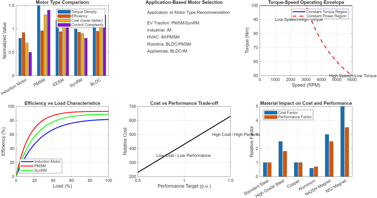 This figure 3 presents the initial phase of motor development, focusing on selecting the appropriate motor topology based on application requirements. The first subplot compares five motor types (Induction Motor, PMSM, EESM, SynRM, and BLDC) across four key metrics: torque density, efficiency, cost, and control complexity. PMSM demonstrates the highest torque density (1.5 normalized) and efficiency (0.96), though with higher cost (1.3) and control complexity (1.4), making it ideal for high-performance applications like electric vehicles. The second subplot provides an application-specific recommendation matrix, showing that EV traction favors PMSM or SynRM, industrial applications suit Induction Motors, HVAC uses IM or PMSM, robotics prefers BLDC or PMSM, and appliances typically use BLDC or IM. The third subplot illustrates the torque-speed operating envelope, highlighting the constant torque region (0-3000 RPM, 100 Nm) and constant power region (3000-6000 RPM, declining torque), which is characteristic of traction motors. The fourth subplot shows efficiency versus load characteristics, with PMSM achieving peak efficiency of 94% at 60-80% load, Induction Motor reaching 85% at 70% load, and SynRM achieving 91% at 65% load, demonstrating the efficiency advantage of PMSM across most load ranges. The fifth subplot quantifies the cost-performance trade-off, showing that increasing performance from 0.5 to 1.5 p.u. increases relative cost from approximately 200 to 550, with the curve becoming steeper beyond 1.2 p.u., indicating diminishing returns at very high performance levels. The sixth subplot compares material options, showing that N52 magnets offer the highest performance factor (3.5) but at the highest cost (5.0), while standard steel provides baseline performance (1.0) at lowest cost (1.0), illustrating the critical material selection decisions in motor design.