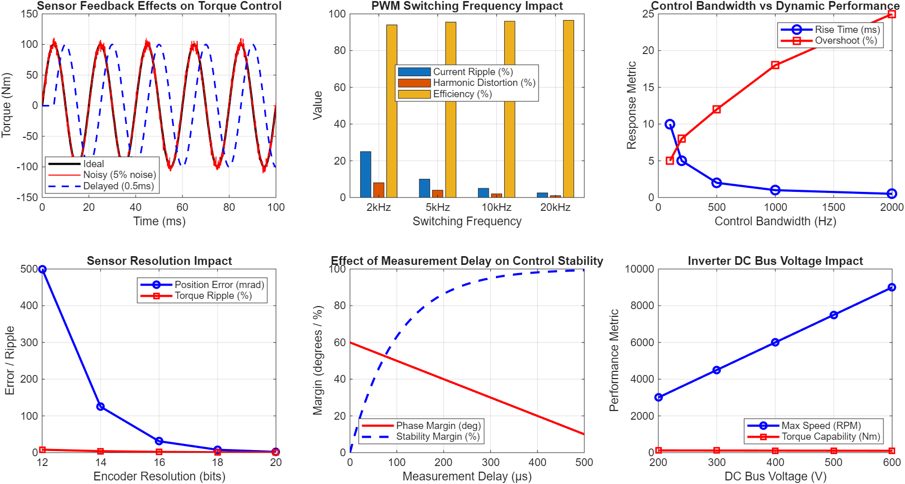 This figure 5 addresses how the motor interacts with controllers and power electronics. The first subplot shows sensor feedback effects on torque control, comparing ideal torque (smooth sinusoid), noisy torque (5% random noise superimposed), and delayed torque (0.5 ms delay). The delayed torque shows phase shift and reduced amplitude, demonstrating that measurement delay and noise significantly impact control accuracy and stability. The second subplot presents PWM switching frequency impact, showing that increasing switching frequency from 2 kHz to 20 kHz reduces current ripple from 25% to 2.5%, reduces harmonic distortion from 8% to 1%, and improves efficiency from 94% to 96.5%, though switching losses increase at higher frequencies, indicating an optimal range of 8-12 kHz for most applications. The third subplot shows control bandwidth versus dynamic performance, with rise time decreasing from 10 ms to 0.5 ms as bandwidth increases from 100 Hz to 2000 Hz, while overshoot increases from 5% to 25%, indicating that bandwidth selection requires balancing responsiveness against stability. The fourth subplot demonstrates sensor resolution impact, showing that increasing encoder resolution from 12 bits to 20 bits reduces position error from 0.5 mrad to 0.002 mrad and reduces torque ripple from 8% to 0.5%, indicating that 16-bit resolution (0.03 mrad error, 2% ripple) provides optimal cost-performance balance. The fifth subplot illustrates measurement delay effects on control stability, showing phase margin decreasing from 60° to 0° as delay increases from 0 to 600 μs, with stability margin decreasing to near zero at 500 μs, indicating that measurement delays exceeding 200 μs significantly compromise control system stability. The sixth subplot shows inverter DC bus voltage impact, with maximum speed increasing from 3000 RPM to 9000 RPM as voltage increases from 200V to 600V, while torque capability slightly decreases from 120 Nm to 100 Nm, demonstrating the fundamental trade-off between voltage rating and torque density.