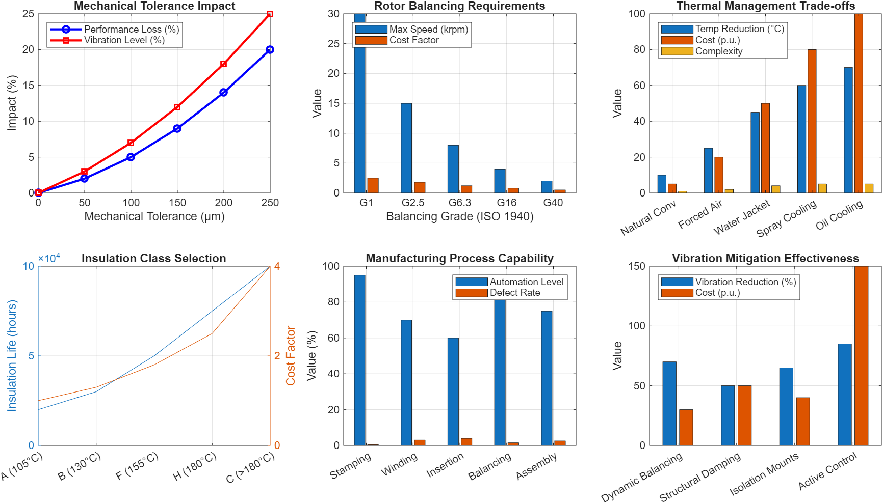 Figure 6 highlights real-world challenges in building electric motors. The first subplot shows mechanical tolerance impact, with performance loss increasing from 0% to 20% and vibration level increasing from 0% to 25% as tolerance increases from 0 to 250 μm, indicating that tolerances must be maintained below 100 μm to keep performance loss under 5% and vibration under 7%. The second subplot presents rotor balancing requirements according to ISO 1940, showing that G1 grade allows maximum speed of 30,000 RPM but costs 2.5 times more than G40 grade (2,000 RPM maximum), with G2.5 grade (15,000 RPM, cost factor 1.8) being typical for most motor applications. The third subplot compares thermal management strategies, showing that water jacket cooling provides 45°C temperature reduction at moderate cost (50 p.u.) and complexity (4), while spray cooling offers 60°C reduction but at higher cost (80 p.u.) and complexity (5), making water jackets the preferred choice for most applications. The fourth subplot shows insulation class selection, with insulation life increasing from 20,000 hours to 100,000 hours as class increases from A to C, while cost increases from 1 to 4 times baseline, indicating that Class F (155°C, 50,000 hours, 1.8x cost) provides optimal balance for most industrial applications. The fifth subplot presents manufacturing process capability, showing automation levels ranging from 95% (stamping) to 60% (winding insertion), with defect rates from 0.5% (stamping) to 4% (winding), indicating that winding processes are the most challenging to automate and require careful quality control. The sixth subplot shows vibration mitigation techniques, with active control providing 85% vibration reduction but at 150 p.u. cost, while dynamic balancing offers 70% reduction at only 30 p.u. cost, making dynamic balancing the most cost-effective approach for most applications.