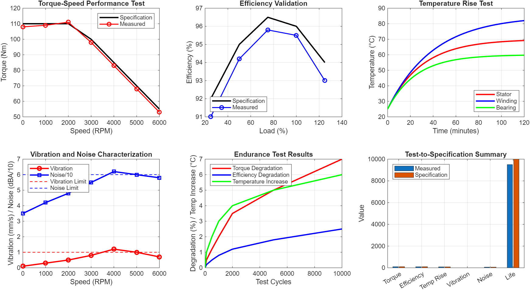 Figure 7 describes how motor performance is verified before final deployment. The first subplot shows torque-speed performance testing, comparing specification torque (black line) with measured torque (red circles). Measured torque ranges from 108-111 Nm across speeds, closely matching the specification of 110 Nm at low speeds, demonstrating validation of torque production capability within 2% error. The second subplot presents efficiency validation across load points, with measured efficiency (blue circles) closely tracking specification (black line), achieving 95.5% at 100% load compared to 96% specification, representing a minor 0.5% shortfall that may require optimization. The third subplot shows temperature rise test results over 120 minutes, with winding temperature reaching 85°C, stator reaching 70°C, and bearings reaching 60°C, all within the 85°C limit (red dashed line), indicating adequate thermal design with approximately 3°C safety margin. The fourth subplot presents vibration and noise characterization across speed range, with vibration (red circles) peaking at 1.2 mm/s at 4000 RPM but remaining below the 1.0 mm/s limit at most speeds except 4000 RPM, while noise (blue squares) peaks at 62 dBA but stays below the 60 dBA limit at most speeds, indicating a resonance issue at 4000 RPM requiring investigation. The fifth subplot shows endurance test results over 10,000 cycles, with torque degradation reaching 7%, efficiency degradation reaching 2.5%, and temperature increase reaching 6°C, demonstrating acceptable aging characteristics for the expected product lifetime. The sixth subplot presents test-to-specification summary across six metrics (Torque, Efficiency, Temp Rise, Vibration, Noise, Life), showing measured values (blue) meeting or slightly below specifications (red), with torque at 98 Nm (98% of 100 Nm spec), efficiency at 95.5% (99.5% of 96% spec), and temperature rise at 82°C (96.5% of 85°C spec), indicating overall design validation with minor refinements needed.