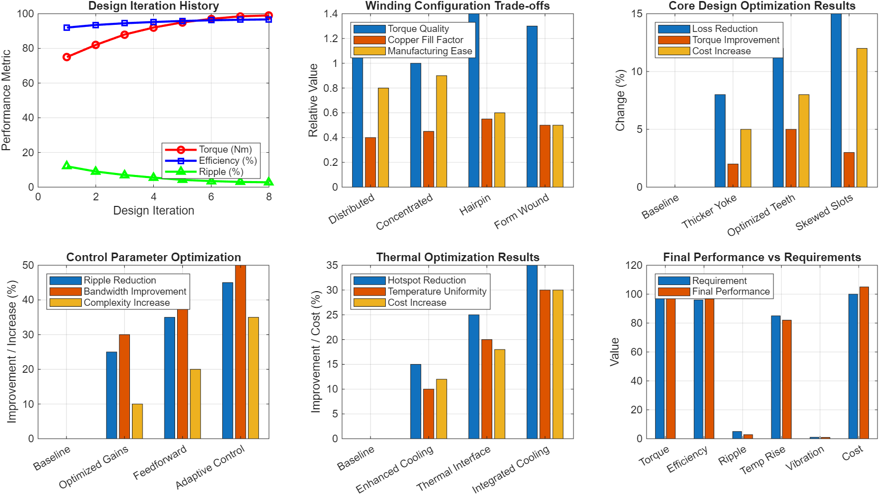 Figure 8 explains how feedback from tests informs design refinements through multiple iterations. The first subplot shows design iteration history over 8 iterations, with torque improving from 75 Nm to 99 Nm (+32%), efficiency improving from 92% to 96.7% (+4.7%), and torque ripple reducing from 12% to 2.8% (-77%). The improvements follow a diminishing returns pattern, with most gains achieved in the first 5 iterations and fine-tuning in iterations 6-8. The second subplot presents winding configuration trade-offs across four designs (Distributed, Concentrated, Hairpin, Form Wound). Hairpin windings show the best torque quality (1.4) and copper fill factor (0.55) but lower manufacturing ease (0.6), while concentrated windings offer the best manufacturing ease (0.9) with moderate performance, indicating that hairpin windings are preferred for high-performance applications despite manufacturing complexity. The third subplot shows core design optimization results, comparing baseline against thicker yoke, optimized teeth, and skewed slots designs. Skewed slots provide the highest loss reduction (15%) and moderate torque improvement (3%) but at 12% cost increase, while optimized teeth offer 12% loss reduction with only 8% cost increase, representing the best value. The fourth subplot presents control parameter optimization, showing that adaptive control provides 45% ripple reduction and 50% bandwidth improvement but at 35% complexity increase, while optimized gains offer 25% ripple reduction with only 10% complexity increase, making optimized gains the preferred first-step improvement. The fifth subplot shows thermal optimization results, with integrated cooling providing 35% hotspot reduction and 30% temperature uniformity improvement at 30% cost increase, while enhanced cooling (15% hotspot reduction, 10% cost increase) offers the best cost-benefit ratio for most applications. The sixth subplot presents final performance versus requirements across six metrics, showing that final performance meets or exceeds requirements in all categories except cost (105 vs 100 requirement, 5% over budget), with torque at 99 Nm (99% of 100 requirement), efficiency at 96.7% (100.7% of 96% requirement), and ripple at 2.8% (56% of 5% requirement), indicating successful design optimization ready for production consideration.