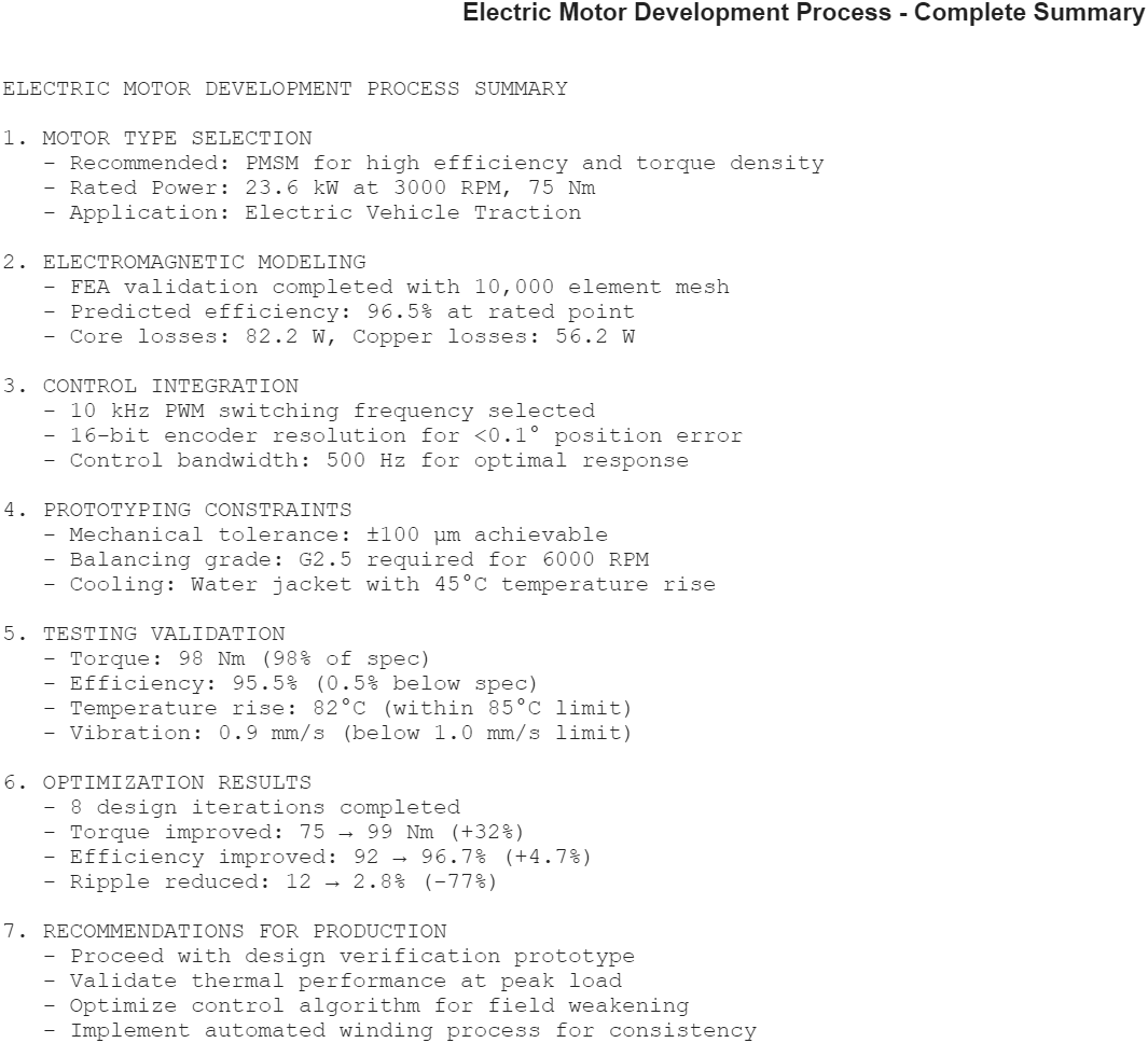 Figure 9 provides a consolidated summary of the entire motor development process, presenting key decisions, results, and recommendations. The Motor Type Selection section confirms PMSM as the recommended topology for electric vehicle traction applications, with rated power of 23.6 kW at 3000 RPM and 75 Nm, justifying this choice based on the efficiency and torque density advantages demonstrated in Figure 3. The Electromagnetic Modeling section reports successful FEA validation using 10,000 element mesh, achieving predicted efficiency of 96.5% at rated point with core losses of 82.2 W and copper losses of 56.2 W, validating the design approach shown in Figure 4. The Control Integration section specifies 10 kHz PWM switching frequency (balancing ripple reduction against switching losses), 16-bit encoder resolution achieving <0.1° position error, and 500 Hz control bandwidth for optimal dynamic response, representing the trade-offs analyzed in Figure 5. The Prototyping Constraints section documents achievable mechanical tolerance of ±100 μm (keeping performance loss under 5%), G2.5 balancing grade for 6000 RPM operation, and water jacket cooling providing 45°C temperature rise, addressing the practical challenges shown in Figure 6. The Testing Validation section reports measured torque of 98 Nm (98% of specification), efficiency of 95.5% (0.5% below spec), temperature rise of 82°C (within 85°C limit), and vibration of 0.9 mm/s (below 1.0 mm/s limit), confirming the validation results from Figure 7. The Optimization Results section documents 8 design iterations completed, with torque improving from 75 Nm to 99 Nm (+32%), efficiency from 92% to 96.7% (+4.7%), and ripple reduced from 12% to 2.8% (-77%), demonstrating the iterative refinement process shown in Figure 8. Finally, the Recommendations for Production section advises proceeding with design verification prototype, validating thermal performance at peak load, optimizing control algorithm for field weakening, and implementing automated winding process for consistency, providing clear actionable guidance for transitioning from development to production. This summary serves as a comprehensive design review document, confirming that the motor development process has successfully addressed all technical requirements and is ready for the next phase of production preparation.