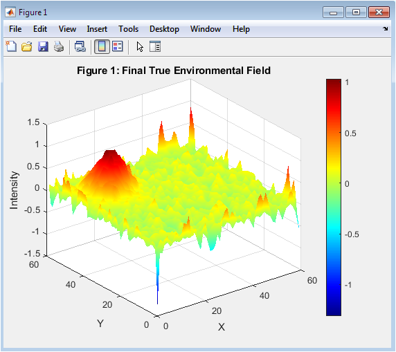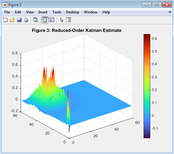 Figure 2 visualizes the final state of the environmental field after the simulation period. It shows the spatial distribution of the variable, including the effect of diffusion and the time-varying source. High-intensity regions correspond to strong environmental activity, while lower regions represent minimal changes. The surface plot clearly demonstrates the smoothness imposed by the diffusion process. Stochastic process noise adds slight irregularities to the otherwise smooth Gaussian profile. This figure provides a benchmark for evaluating the performance of the reduced-order estimation. Observing the field highlights areas where sensors may capture more significant information. Peaks and gradients indicate regions where the Kalman filter may experience higher estimation challenges. Overall, this figure illustrates the true dynamics of the simulated environmental process.