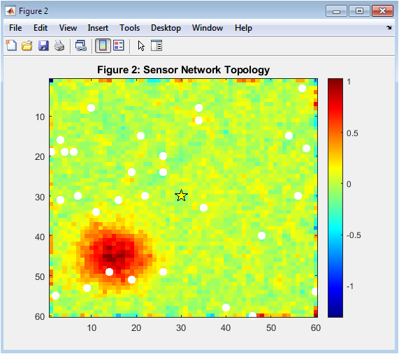 Figure 3 shows the spatial deployment of sensor nodes in the environmental field along with the base station. Active sensors are highlighted as white circles, while the base station is marked with a yellow star. This plot demonstrates sensor coverage and proximity to the base station. Sensor positions are randomly distributed, simulating realistic deployment scenarios. The topology highlights potential coverage gaps and areas prone to packet loss. Node distribution affects the quality of field reconstruction by the Kalman filter. The scatter overlay allows visualization of network density in regions with higher activity. This figure also helps analyze energy consumption patterns related to node distance from the base station. It provides an overview of the network layout used for simulation.