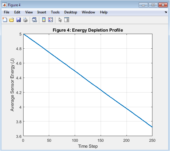 Figure 5 depicts the temporal evolution of average sensor energy throughout the simulation. Energy decreases over time due to sensing and data transmission operations. The plot illustrates the impact of energy-aware modeling on network lifetime. Faster depletion occurs when many nodes are active simultaneously. This figure also demonstrates how adaptive time-stepping affects energy usage. Gradual energy decline confirms the effectiveness of cost parameters assigned to sensing and transmission. It highlights when sensors may become inactive due to energy exhaustion. Observing trends in energy consumption helps optimize deployment and sampling strategies. This figure is essential for assessing network sustainability.