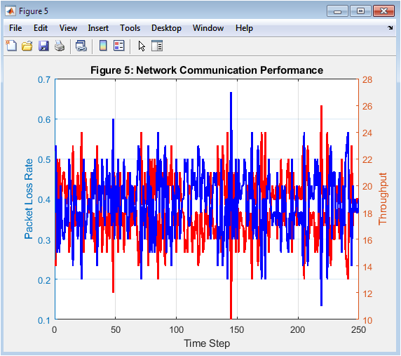 Figure 6 illustrates network communication performance by plotting packet loss rate and throughput over time. Packet loss is shown in red, representing the proportion of failed transmissions. Throughput is plotted in blue, indicating the number of successfully active sensors per time step. The dual-axis plot reveals trade-offs between connectivity and network reliability. Increased packet loss corresponds to reduced throughput. Distance-dependent transmission probabilities affect network performance dynamics. The plot demonstrates how energy depletion indirectly influences communication efficiency. Observing fluctuations helps understand network robustness under varying conditions. It provides insights for designing adaptive communication strategies.