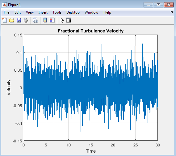 The proposed fractional-order turbulence model is implemented using a time-domain numerical approach with Caputo fractional derivatives approximated via the Grünwald–Letnikov scheme [17]. The simulation domain consists of a one-dimensional velocity field, where turbulent fluctuations are evolved over a fixed time interval with step size (Delta t). The governing equation combines nonlinear self-interaction, viscous damping, and stochastic forcing to mimic essential features of turbulence.