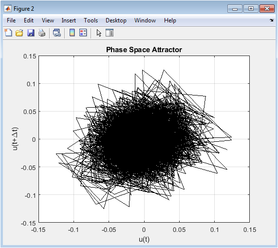 The phase-space plot displays (u( t+ Delta t)) versus ( u(t) ), revealing the dynamic attractor of the system. The trajectory forms a complex, folded structure, indicative of nonlinear and chaotic behavior inherent in turbulence. Long-range correlations induced by the fractional derivative manifest as smooth, persistent loops in the attractor. The phase-space reconstruction allows visualization of the underlying deterministic structure amid stochastic forcing. Areas of dense trajectory highlight frequently visited states, while sparse regions indicate less probable velocity combinations. This plot provides insight into the stability and recurrence properties of the turbulent system. The attractor confirms the coexistence of memory-driven dynamics and randomness. Comparing different realizations shows slight variations, emphasizing the role of stochasticity. The attractor also informs the predictability and phase coherence of the turbulent signal. Overall, it illustrates how fractional-order dynamics influence the geometry of the velocity field in phase space.