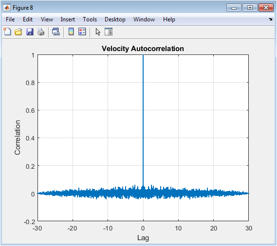 This figure depicts the normalized autocorrelation function of the ensemble-averaged velocity. The correlation decays gradually with increasing lag, reflecting the persistence of velocity fluctuations due to fractional memory. Short-lag correlations are strong, representing immediate temporal dependence, while long-lag correlations decay slowly, indicating non-Markovian behavior. The oscillatory behavior at intermediate lags captures repeated coherent fluctuations in the system. Ensemble averaging produces a smooth correlation curve while retaining memory effects. This plot is essential for quantifying the temporal coherence of turbulence. Comparison of correlation decay rates provides insight into the influence of the fractional order on memory strength. The autocorrelation function also informs the Hurst exponent estimation. Overall, the figure confirms that the model reproduces realistic long-range temporal correlations, a hallmark of turbulent flows.