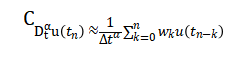 For numerical simulations, the Caputo derivative is approximated using the Grünwald–Letnikov scheme. The fractional derivative is replaced by a discrete convolution sum over previous time steps, where wkw_kwk are memory weights. This approximation transforms the integral into a computationally tractable form while retaining long-range memory effects. Each past value of uuu is scaled by a coefficient wkw_kwk that decays algebraically with the lag kkk. The fractional order αalphaα determines how quickly the weights decay, directly controlling the memory strength. Smaller αalphaα values produce stronger contributions from older states, enhancing nonlocal effects. This approach allows the model to capture the persistence and correlation structure of turbulent flows. The method is suitable for time stepping with a fixed interval ΔtDelta tΔt and can be efficiently implemented for ensemble simulations. It forms the backbone of the discrete-time evolution of fractional turbulence. Through this approximation, complex memory effects are accurately represented in numerical experiments.