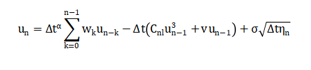 This discrete-time equation represents the numerical update of the velocity field at each time step. The first term incorporates the fractional memory using the weighted sum of past states. The second term accounts for nonlinear energy transfer and viscous dissipation in a standard Euler-type discretization. The last term introduces stochastic forcing through a scaled Gaussian random variable ηn eta_nηn. Together, these terms model the combined effects of memory, nonlinearity, damping, and randomness in turbulence. This formulation allows ensemble simulations, enabling statistical evaluation of turbulent quantities. The scheme is explicit and computationally efficient while preserving key turbulence features such as intermittency and long-range correlations. The balance among fractional memory, nonlinearity, and stochastic forcing is critical for reproducing realistic turbulent dynamics. This discrete model is the foundation for computing energy, structure functions, and spectral properties.