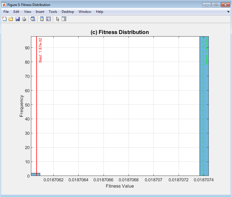 This histogram provides a snapshot of the population’s state at the end of the evolutionary run, displaying the frequency distribution of fitness values across all individuals. The blue bars represent the count of solutions falling within specific fitness ranges, revealing whether the population has concentrated around a narrow band of high-quality solutions or maintains a broad spread. The vertical red line marks the fitness of the single best individual found, while the green dashed line indicates the population’s mean fitness. The distance between these lines shows how skewed the distribution is toward better solutions. The shape of the histogram whether unimodal, multimodal, or uniform offers insights into the search landscape and the algorithm’s effectiveness at discovering and retaining high-performing individuals, complementing the temporal view provided by the convergence plot.